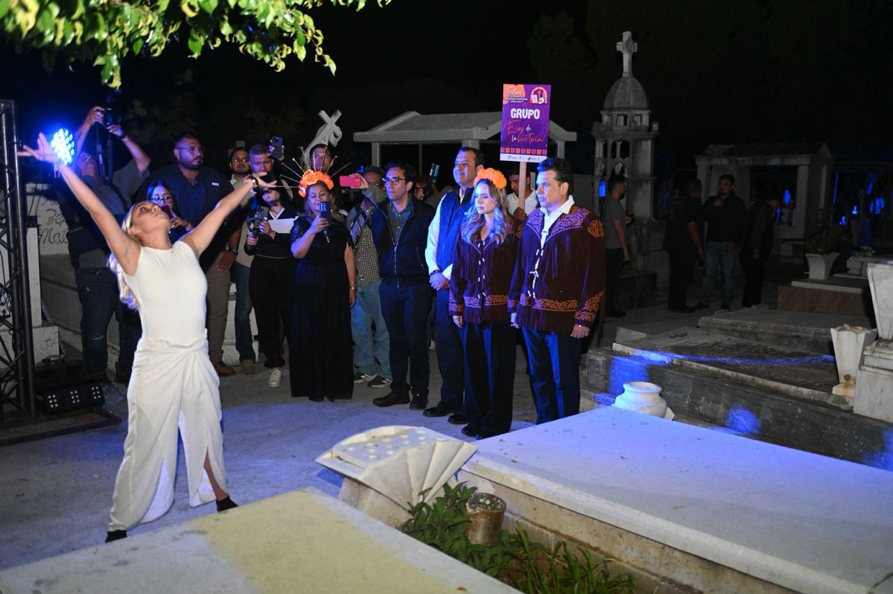 Cd. Victoria, Tamaulipas.- . – Con altares, catrinas vivientes y recorrido Ecos de la Historia dentro del antiguo panteón del Cero Morelos, el Gobierno de Victoria celebró el festival “La Muerte Nuestra Tradición Viva 2025”.