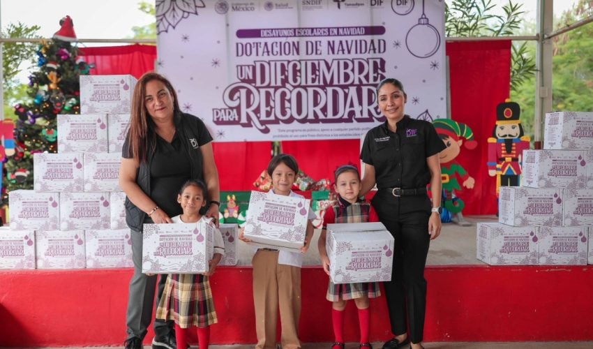 González, Tamaulipas.– Durante el mes de diciembre, el Sistema DIF Tamaulipas, que preside la doctora María de Villarreal, realizó en todo el estado la entrega de la dotación navideña del Programa Desayunos Escolares “Una Navidad para Recordar”, mediante la cual se benefició a alumnas y alumnos de 2,575 escuelas de los 43 municipios de la entidad.